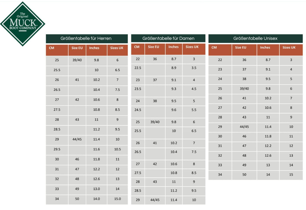 Bei den Stiefeln von Muck Boot ist 15 mm zusätzliche Zehenfreiheit in der Größe einkalkuliert. Miss deine Fußlänge und entnimm der obigen Tabelle, welche Größe zu dir passt – die 15 mm Spielraum sind bereits in der Größe enthalten.