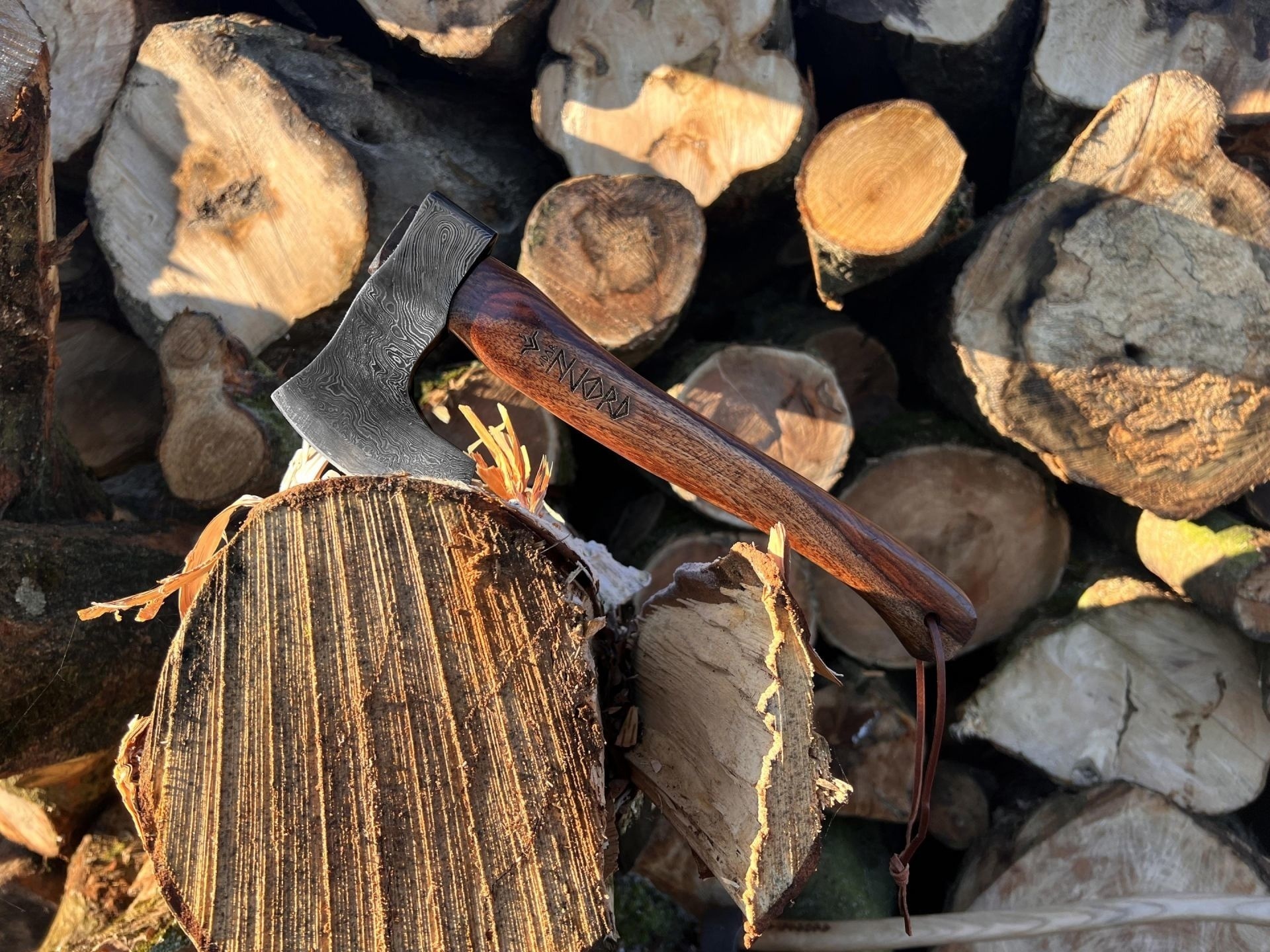 Eine ausgezeichnete Wahl für die Holzbearbeitung und das Hacken. Gefertigt aus handgeschmiedetem Schichtdamaststahl und einem griffigen Pallisanderholzstiel. Die Axt ist mit einer traditionellen Schutzmischung aus Bienenwachs und Leinöl behandelt.